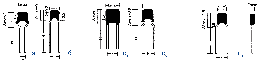 | F (±0,2) | Нмин (±0,5) | Lмакс | Wмакс | Tмакс | NPO | X7R | Y5V (Z5U) | |||