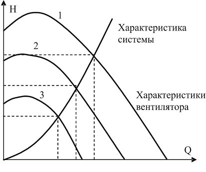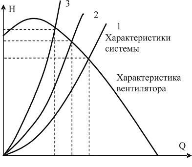 Рис.1. Характеристики вентилятора и системы при регулировании шибером