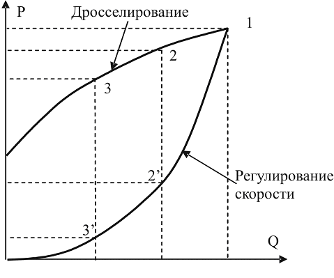 Аналогичные кривые можно построить и для центробежных насосов. Здесь изменение производительности обычно осуществляется дроссельными заслонками на выходе насоса. На рис. 3 представлен сравнительный график мощности, потребляемой насосом, в зависимости от расхода при регулировании дросселированием и частотном регулировании. Разность между значениями этими кривыми при заданном расходе позволяет определить экономию энергии при частотном регулировании по сравнению с регулированием дроссельной заслонкой.