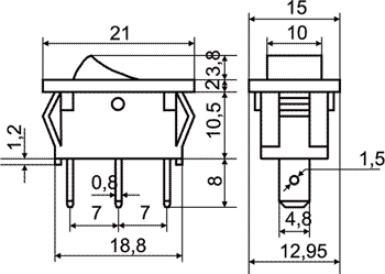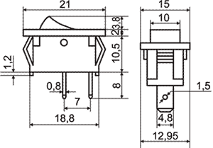 | 2 контакта; ON-OFF (SPST) | 2 контакта; ON-OFF (SPST) | 2 контакта; ON-OFF (SPST) Возможные цветовые варианты: черный корпус-белая клавиша; белый корпус-красная клавиша; черный корпус-черная клавиша |