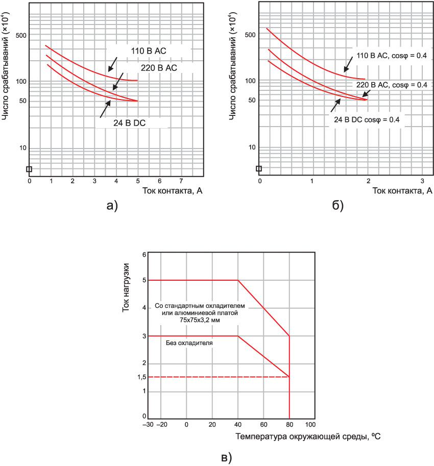 Рис. 3. Зависимость: а) числа срабатываний электромагнитного реле от коммутируемого тока и напряжения для активной нагрузки; б) числа срабатываний электромагнитного реле от коммутируемого тока и напряжения для индуктивной нагрузки; в) коммутируемого тока от температуры для твердотельного реле