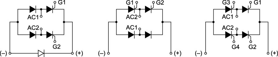 Схемы, представленные на рис. 2, в конфигурации 0 и 1 по два диода моста заменены на тиристоры (G1 и G2) с выведенным управляющим электродом. В схеме конфигурации 3 все четыре диода — это тиристоры (G1, G2, G3 и G4).