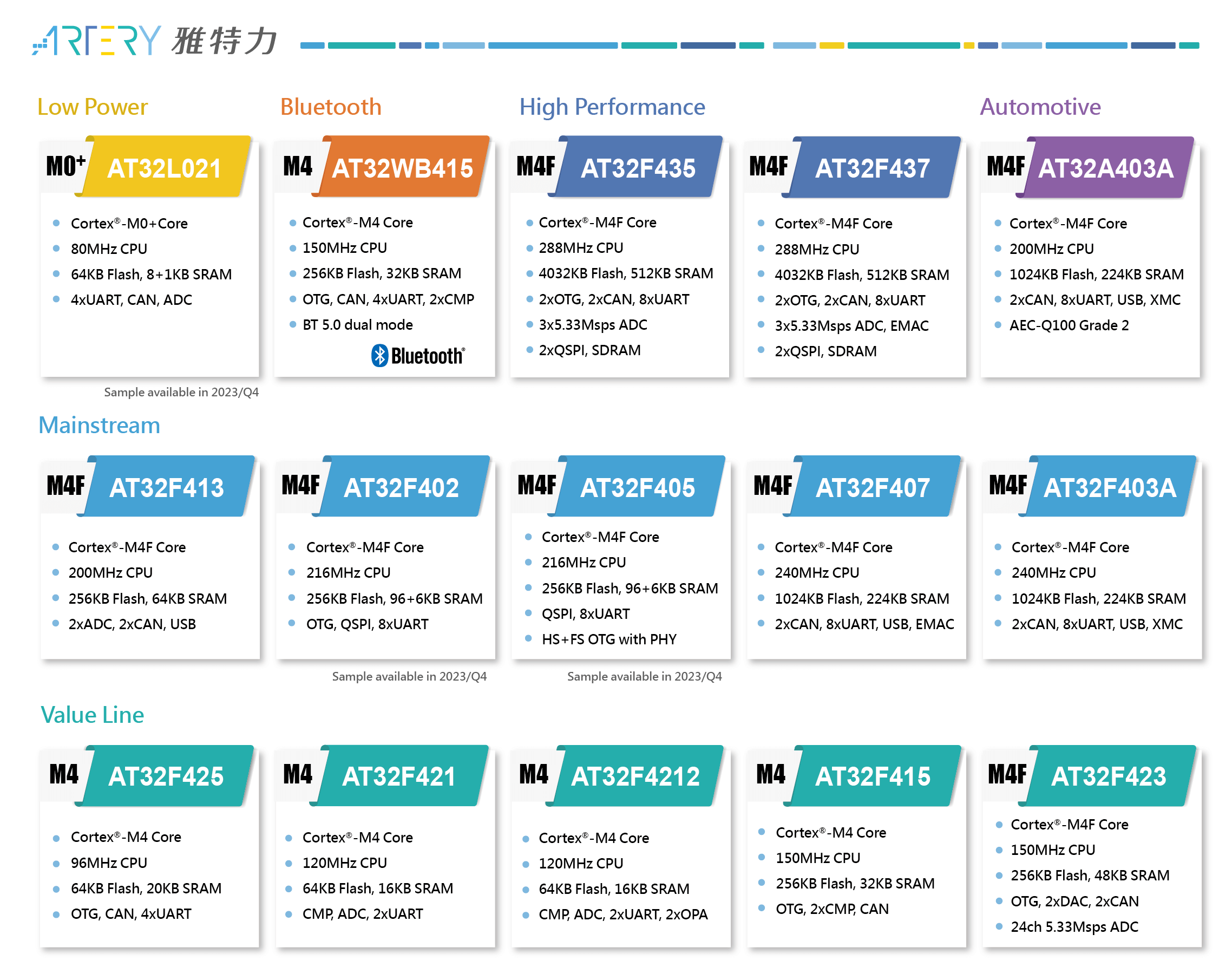 Компания ARTERY Technology – разработчик и производитель 32-битных микроконтроллеров, образованная в 2016 в КНР. Она обладает филиалами в Шэньчжэне, Сучжоу, Шанхае, Чунцине и даже на о. Тайвань. ARTERY фокусируется на разработке микроконтроллеров на основе ARM® Cortex®-M4/M0+, выпускаемых по проектным нормам 55 нм. Высокопроизводительные и энергоэффективные микроконтроллеры ARTERY применяются в различных продуктах: от принтеров до роботов-пылесосов, от промышленных швейных машинок до управления сервоприводами и т.д.
