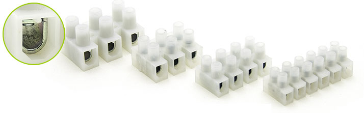 Клеммные колодки могут быть различных размеров, в зависимости от сечения соединяемого провода. Строительные клеммы применяются для подсоединения проводов площадью поперечного сечения от 0.75 до 8 мм2 и различной токовой нагрузкой. Конструктивно, клеммники для соединения кабеля, выполняются в виде корпуса из негорючего материала, в который встроены металлические или латунные контактные гильзы с винтовыми зажимами. Различают два типа: стандартные, с открытыми винтовыми клеммами для жестких одножильных проводов и клеммники с флажками для защиты мягкого многожильного провода и надежного, плотного прижима.