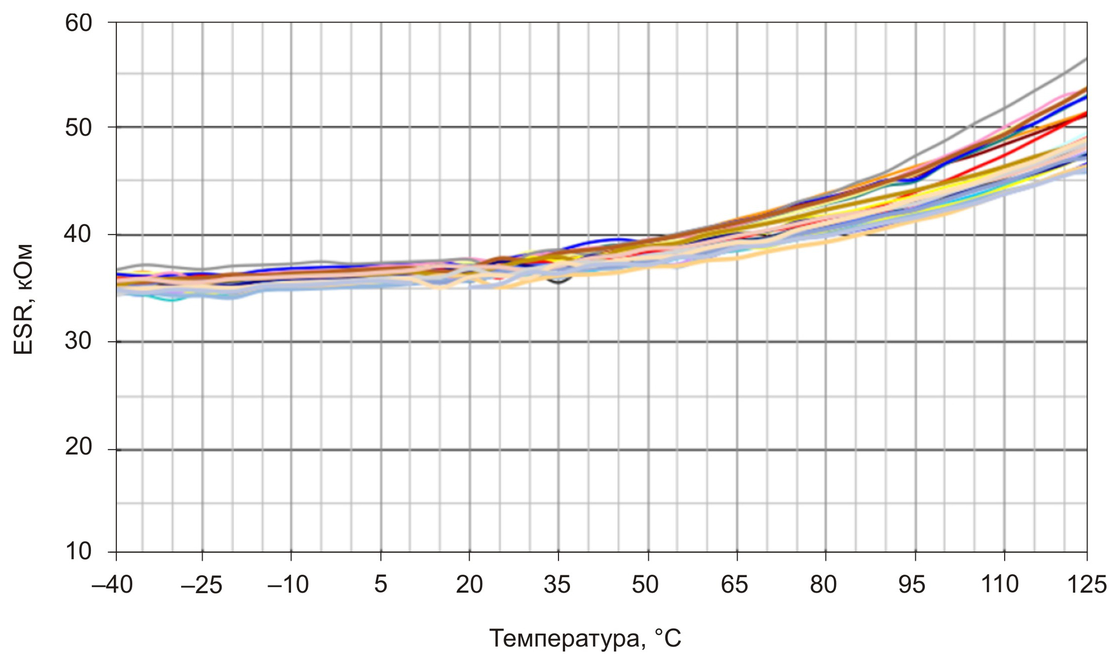 Если соотношение G > GCRIT не выполняется, работа генератора Пирса является неустойчивой. Поскольку чем ниже энергопотребление в микросхемах логики, тем меньше трансимпедансный коэффициент передачи, не следует выбирать микросхемы с пониженным энергопотреблением. Кроме того, необходимо учитывать изменение сопротивления ESR в зависимости от температуры. В качестве примера на рисунке 3 показана зависимость ESR резонаторов семейства ABS 07 разных модификаций от температуры.