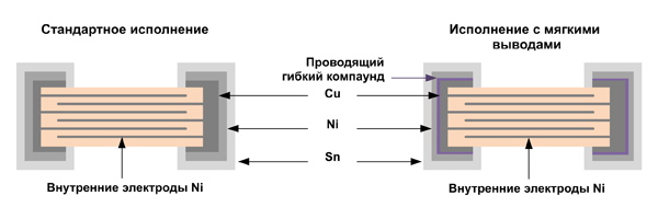 В конструктиве конденсаторов с мягкими выводами между внутренними и внешними электродами помещен слой эластичного проводящего компаунда (рисунок 5), который демпфирует деформации и значительно повышает живучесть компонентов.
