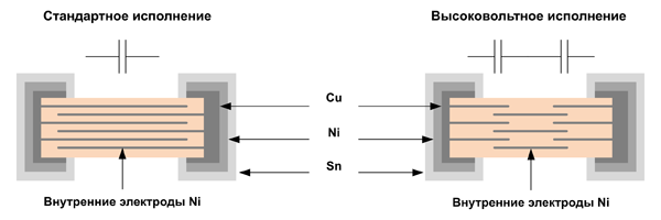 Рис. 4. Конструкции стандартных и высоковольтных конденсаторов