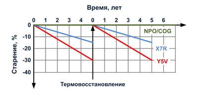 Емкость конденсаторов класса 1 почти не изменяется. Емкость конденсаторов класса 2 изменяется в течение времени (рисунок 6).