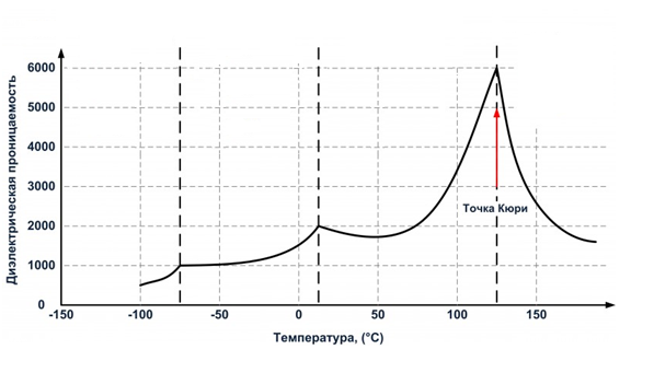 В качестве диэлектрика в MLCC класса 2 используется титанат бария BaTiO3. Температура Кюри для этого материала приблизительно + 130° С (рисунок 7).