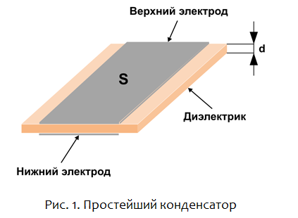 Обычно конденсатор представляет собой трехслойную конструкцию, состоящую из двух пластин-электродов и слоя диэлектрика между ними (рисунок 1).