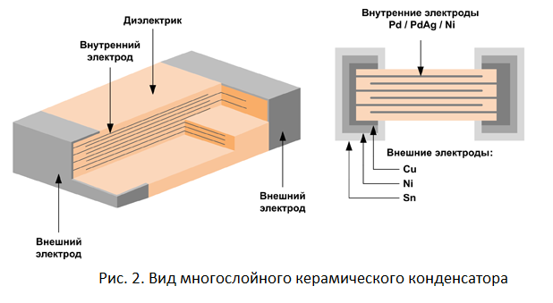 В MLCC используется многослойная структура, состоящая из чередующихся слоев керамического диэлектрика и металлических пленочных электродов (рисунок 2). На краях металлические электроды соединяются и образуют торцевые выводы, которые покрываются оловом. Таким образом получается параллельное соединение простейших конденсаторов, количество которых пропорционально числу слоёв. При этом увеличивается общая площадь, а значит – и повышается ёмкость. Итоговая емкость MLCC будет равна сумме емкостей простейших конденсаторов. Например для X7R MLCC с номинальным напряжением 100 В типоразмера 1812 возможно 39-кратное увеличение емкости по сравнению с ЧИП-танталовым конденсатором.