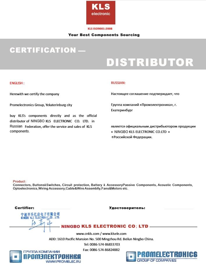 KLS Electronic Co., Ltd – китайская компания, основанная в провинции Нинбо в 2002 г. В настоящее время KLS является одним из лидеров среди китайских производителей коннекторов с отличным соотношением цены и качества. Её продукция сертифицирована по требованиям RoHS, что позволяет её применение в устройствах, предназначенных для западных рынков.