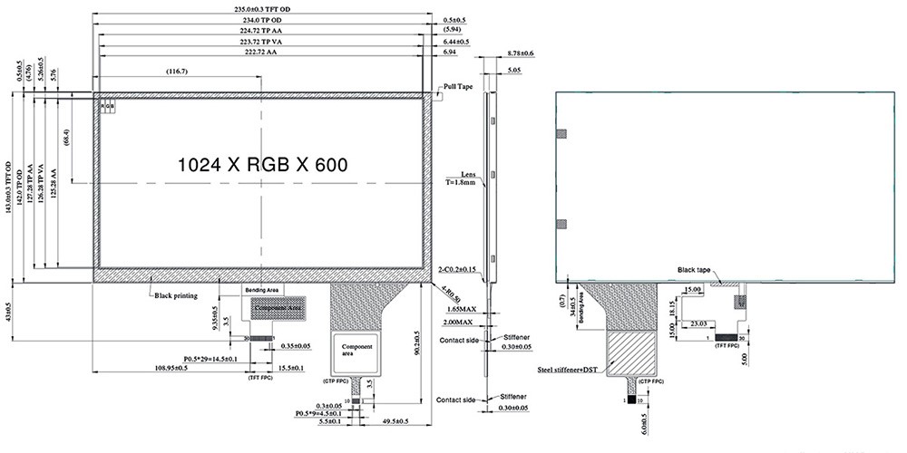 WF101JTYAHLNB0 - 10.1" цветной IPS TFT-модуль с разрешением 1024x600 пикселей. Дисплей имеет 2 встроенных контроллера EK79007AD3 и EK73217BCGA, с поддержкой 4-х канального интерфейса MIPI DSI. Емкостная сенсорная тач-панель (PCAP) с встроенным контроллером ILI2511 с поддержкой USB и I2C интерфейсов. Яркость - 400 Кд/м2, контрастность - 800:1 (типовое значение), широкие углы обзор: Левый угол: 85° / Правый угол: 85° / Верх: 85° / Низ: 85° (типовое значение). Если применение требует дисплея с высокой яркостью - предлагается дисплей WF101JSYAHMNB0 со увеличенной яркостью - 900 кд/м2 ( типовое значение).