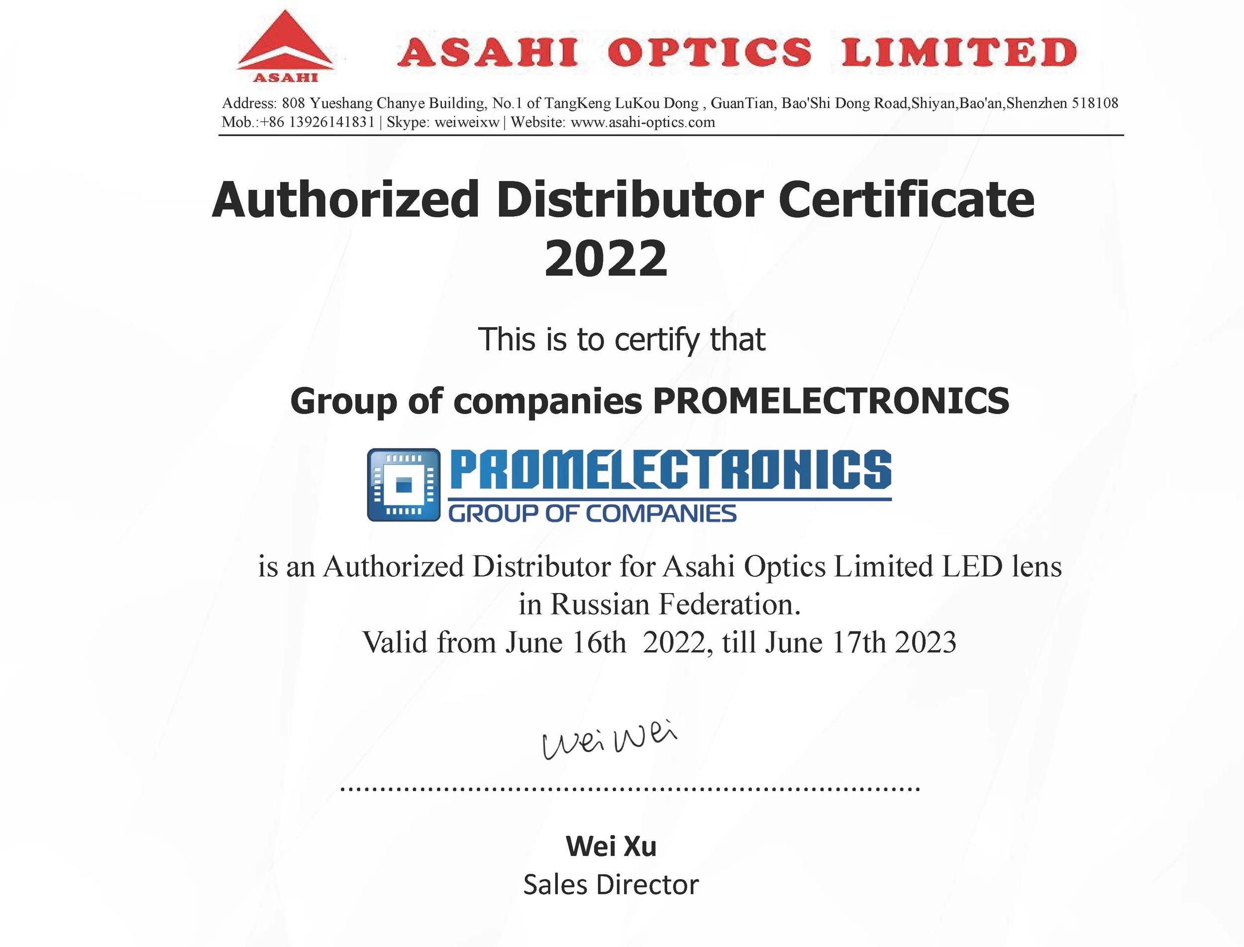 Группа компаний Промэлектроника подписала эксклюзивное дистрибьютерское соглашение с компанией ASAHI OPTICS LIMITED.