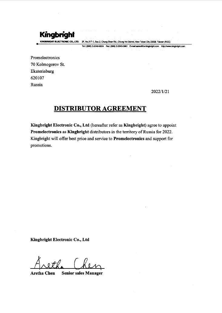 "Промэлектроника" является официальным дистрибьютором продукции Kingbright.