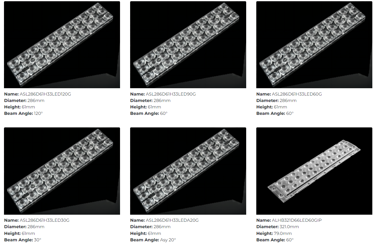 3-х рядные линейные линзы ASAHI OPTICS серии 3x11, оптимизированы для коммерческого и промышленного применения, благодаря широкому выбору диаграмм направленности с углами 30°, 60°, 90°, 120 позволяя добиться лучшего распределения света, уменьшить блики, повысить эффективность освещения и улучшить общее качество световой картины на объекте.