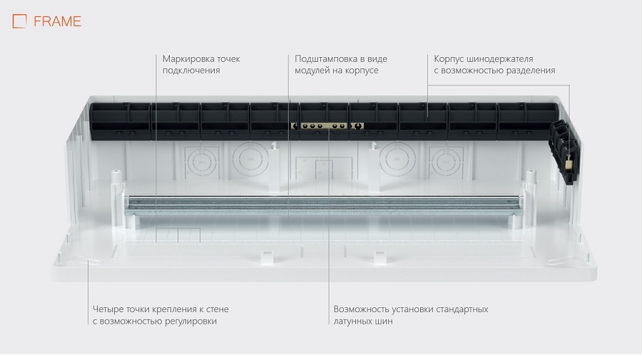 - Возможности - крепление шин PE и N по всем стенкам корпуса.