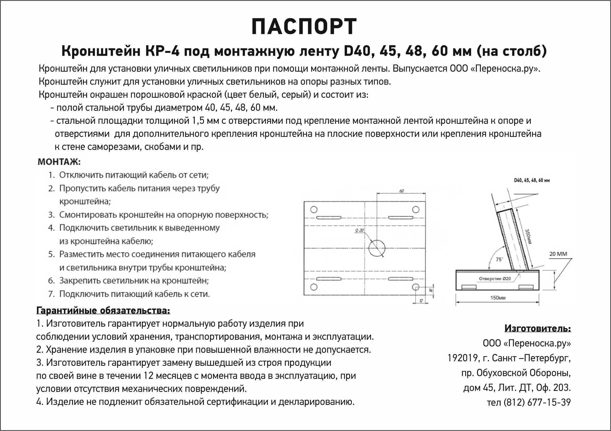 Описание Кронштейн настенный и на столб монтажной лентой диаметр трубы 45мм белый для уличного светильника 00022