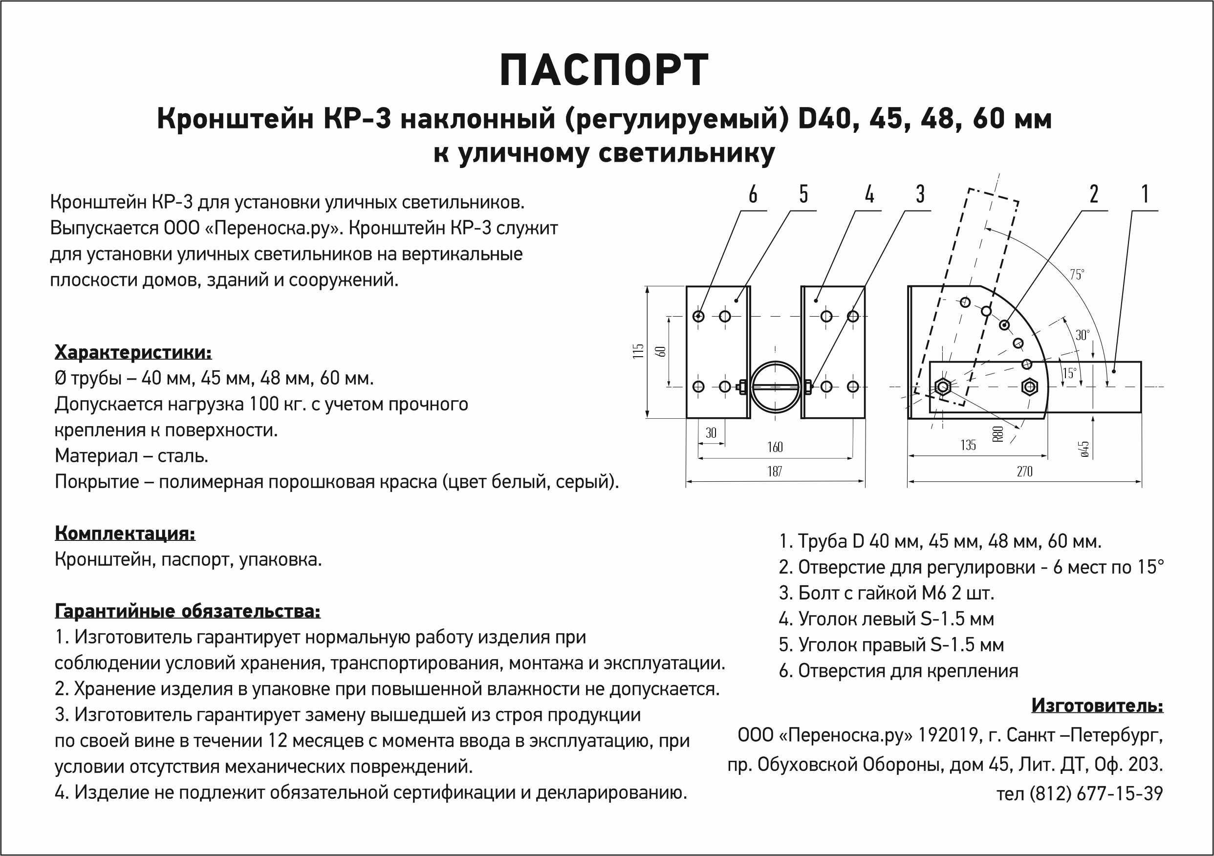 Описание Кронштейн настенный регулируемый угол наклона диаметр трубы 45мм серый для уличного светильника 00028