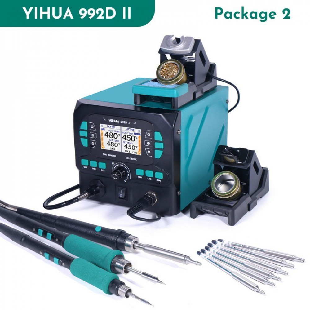 YIHUA992D-II PACKAGE 2, Термовоздушная паяльная станция с двумя паяльниками и мини феном. Паяльники 716D с жалом C210 240Вт/ 616D с жалом C245 290Вт, фен Q208S, температура фена 90-480°С, в комплекте насадки и дополнительные жала