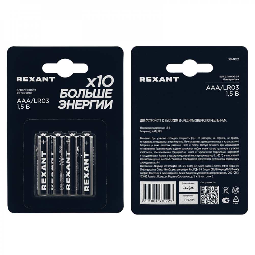 Описание Батарейка алкалиновая AAA/LR03 мизинчиковая 1,5В 39-1012