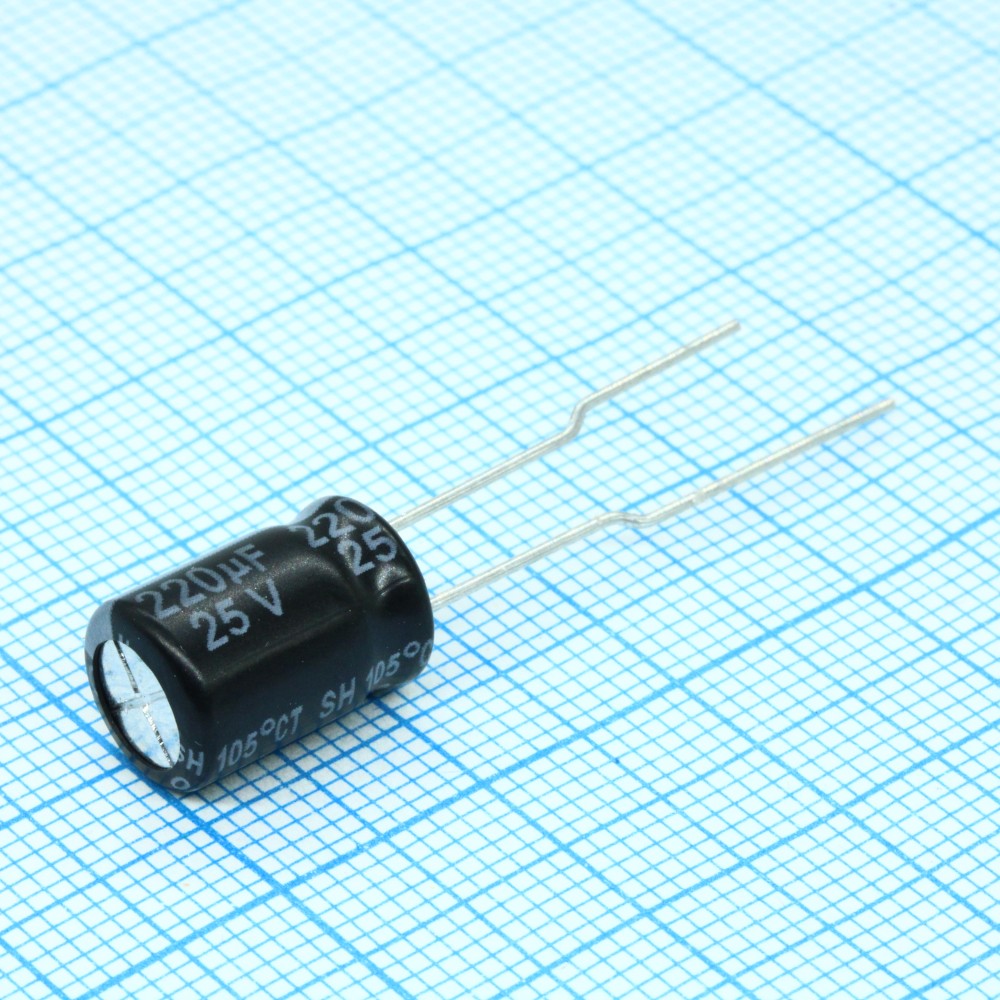 Конденсатор алюминиевый электролитический радиальный 220мкФ 25В ±20% 8*12 P:3.5мм 150мА 2000ч 105°C