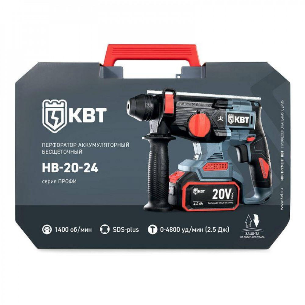 Перфоратор аккумуляторный HB-20-24 серия ПРОФИ, Перфоратор аккумуляторный 20V бесщеточный с максимальным размером оснастки SDS-Plus до 24 мм, 2 аккумуляторные батареи: Li-ion, 20 В/4Ач, зарядное устройство, кейс