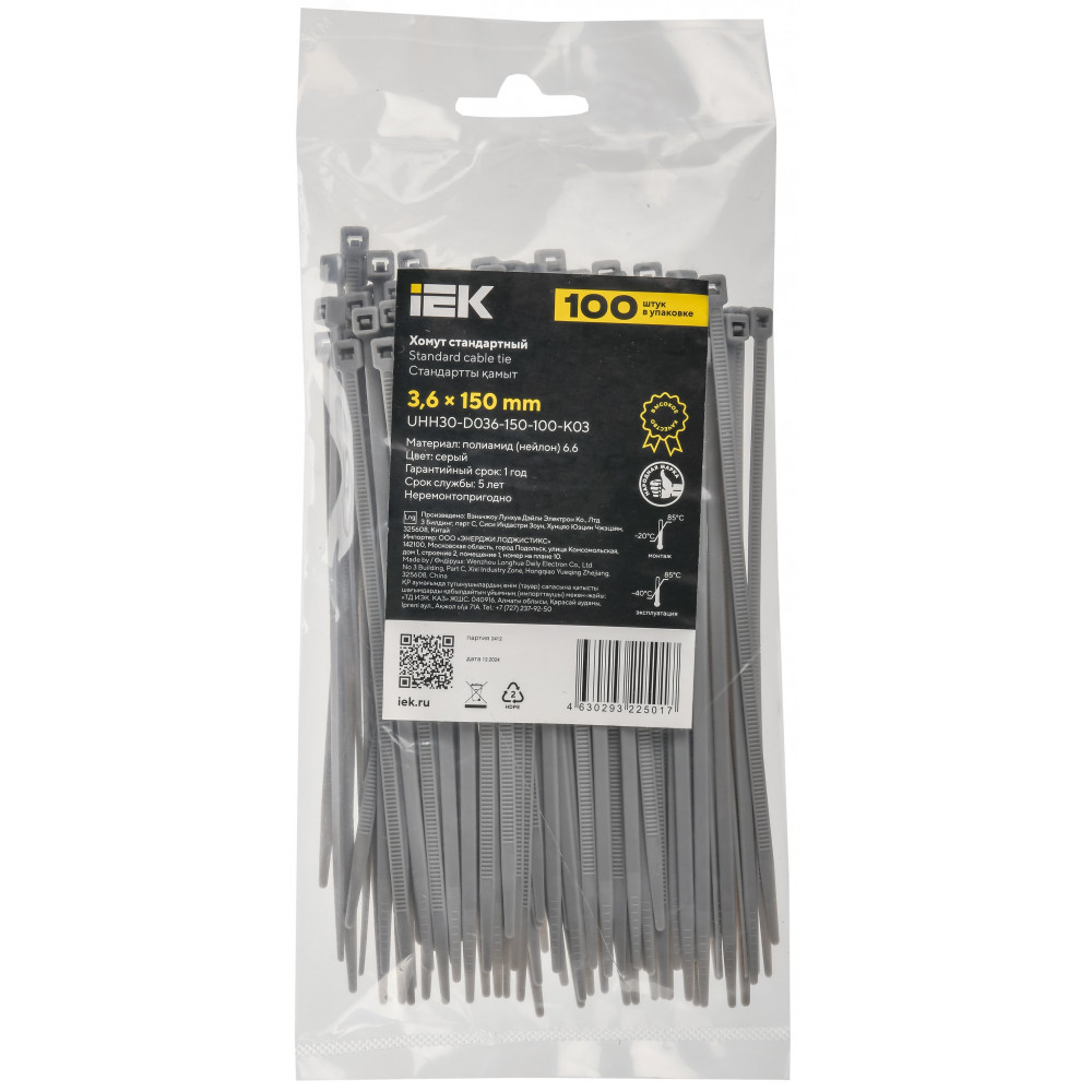Описание Хомут 3.6х150мм P6.6 стандартный сер. (уп.100шт) IEK UHH30-D036-150-100-K03