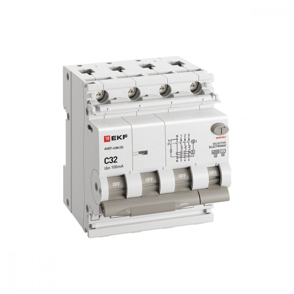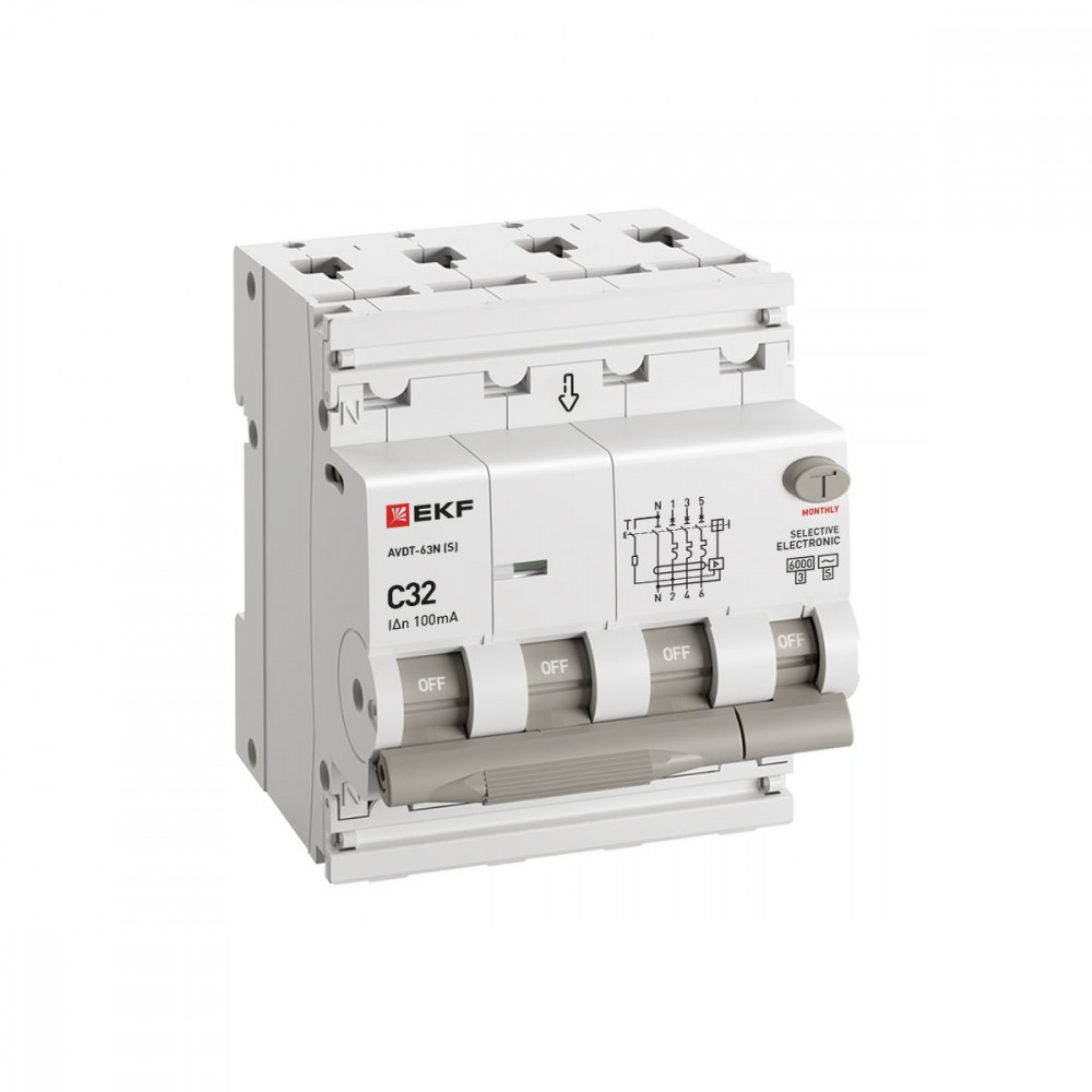Автоматический выключатель дифференциального тока селективный АВДТ-63N (S) 3P+N 32А 100мА характеристика C тип AC электронный 6кА PROXIMA EKF D63N46ES32C100, Дифференциальная защита: УЗО, дифф блок