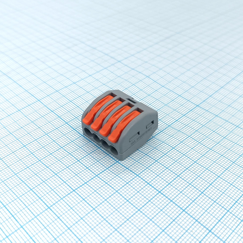 Рычажная клемма, соединительная, универсальная, 4 полюса, сечение проводника 0,08 - 4,0 мм кв., 250V, 32A,цвет корпуса: серый, цвет рычагов: оранжевый,в упаковке 50 штук (Аналог 222-414)