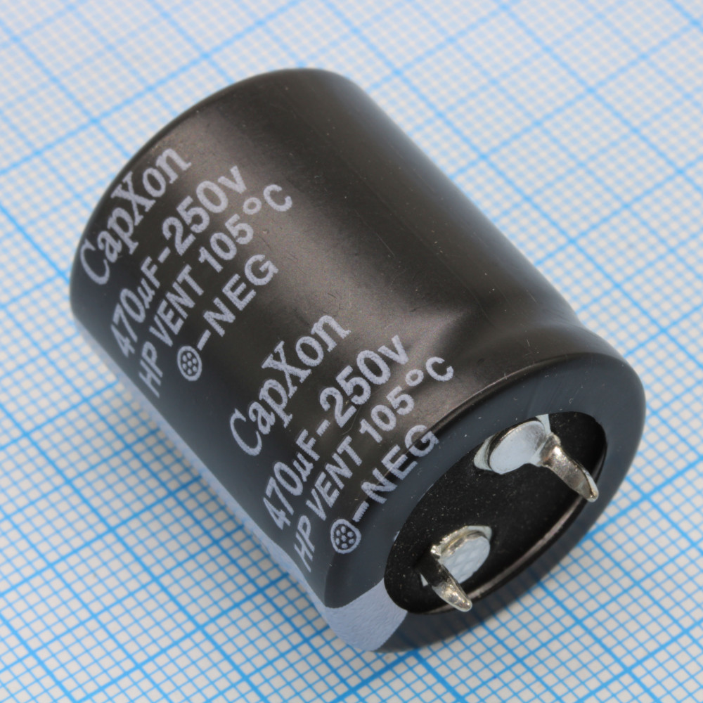 Конденсатор алюминиевый электролитический 470мкФ 250В ±20% (25 X 30мм) защелкиваемые выводы 10мм 2000час 105°С россыпь