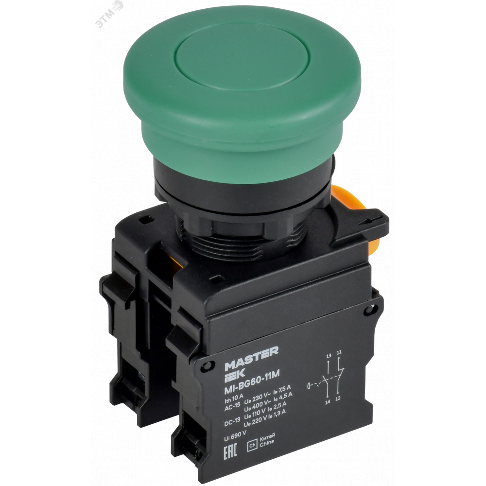 Описание Кнопка ""Грибок"" без фиксации. d - 22 мм 1NO+1NC зел-ная MASTER MI-BG60-11M-3-21-K06