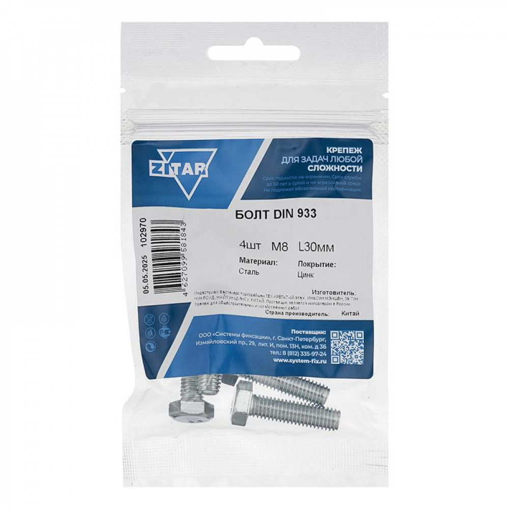 Описание Болт с шестигранной головкой М8х30 DIN 933 кл. прочн. 8.8 оцинк. (пакет) (уп.4шт) Zitar 102970