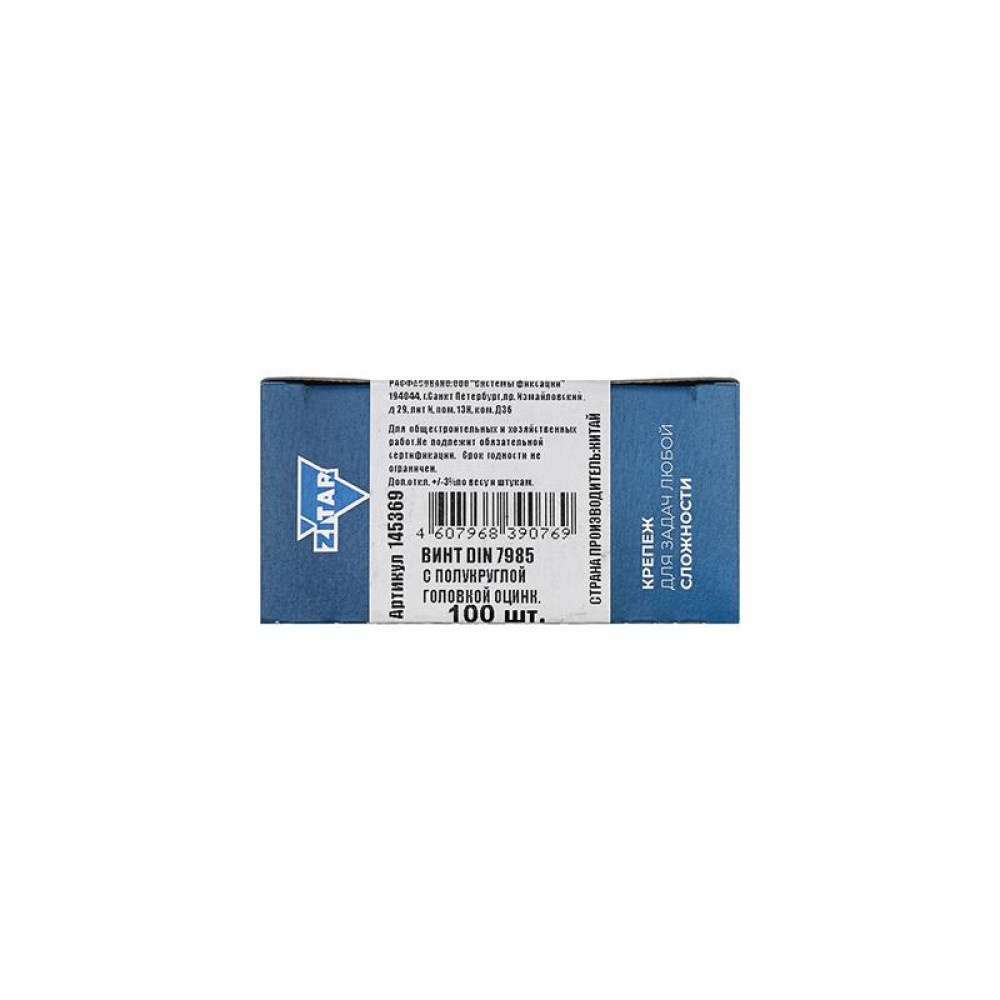 Описание Винт с полукруглой головкой М6х10 DIN 7985 оцинк. (уп.100шт) Zitar 145369