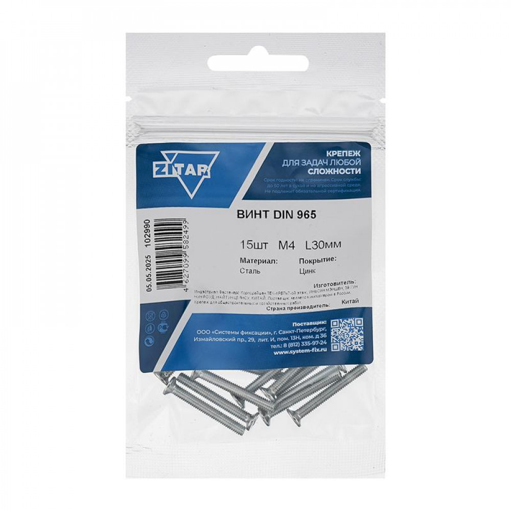 Доставка Винт с потайной головкой М4х30 DIN 965 оцинк. (уп.15шт) Tech-Krep/Zitar 102990