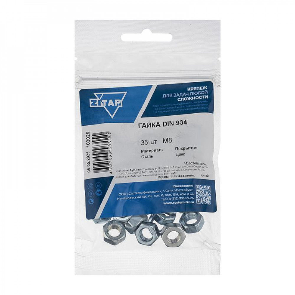 Доставка Гайка шестигранная М8 DIN934 цинк. (пакет) (уп.35шт) Tech-Krep/Zitar 103026