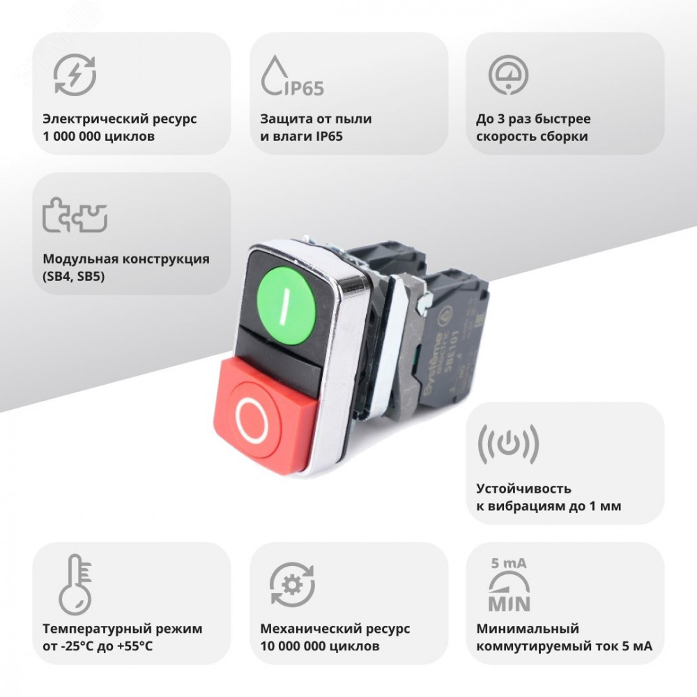 Описание Кнопка SB4 двойная в сборе модульная 22мм зелен I+красн O металл 1НО+1НЗ SB4BA73415