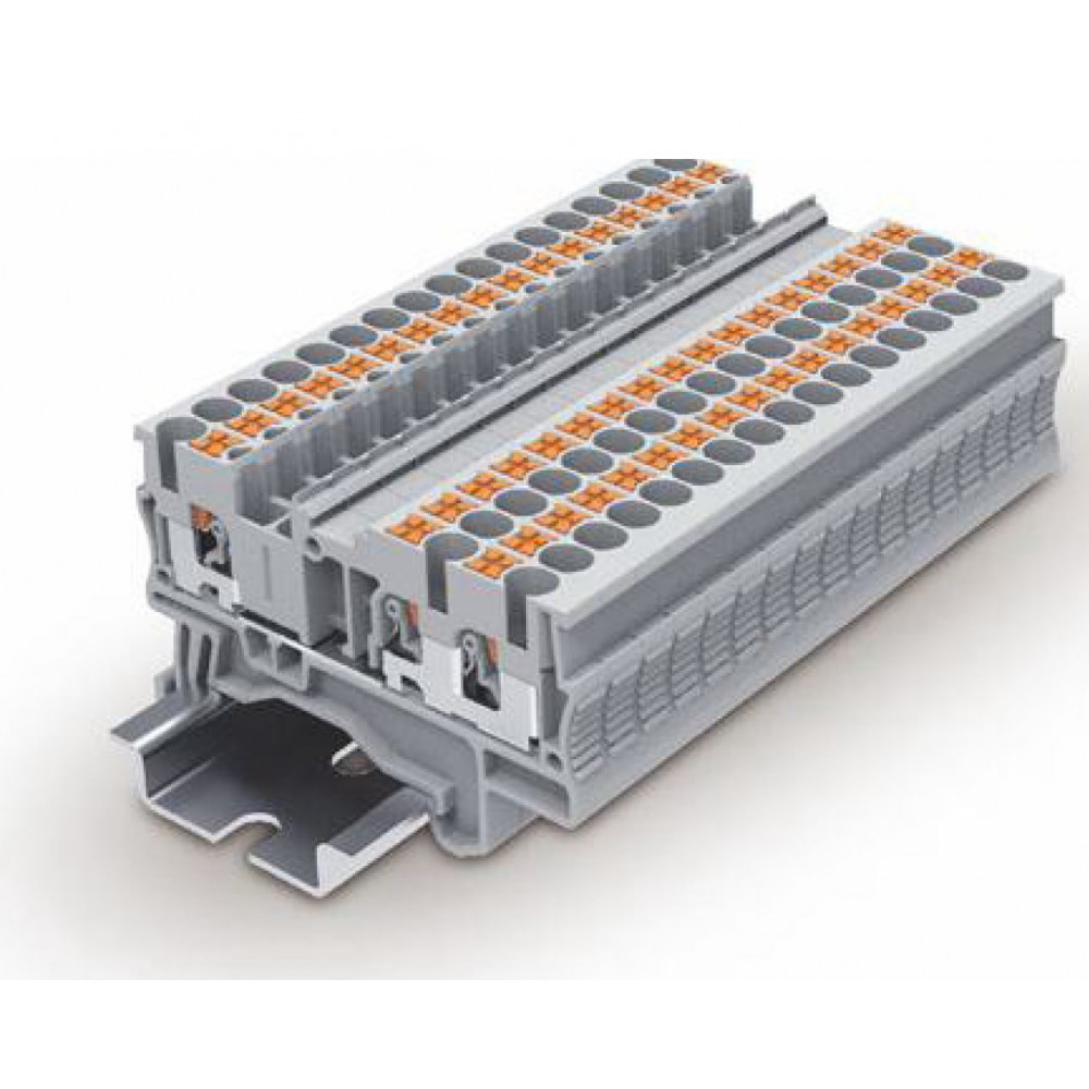 Проходная клемма,3 точки подключения, тип фиксации провода: Push-in, номинальное сечение: 2,5 мм кв., 24A, 800V, ширина: 5,2 мм, цвет: серый, тип монтажа: DIN35