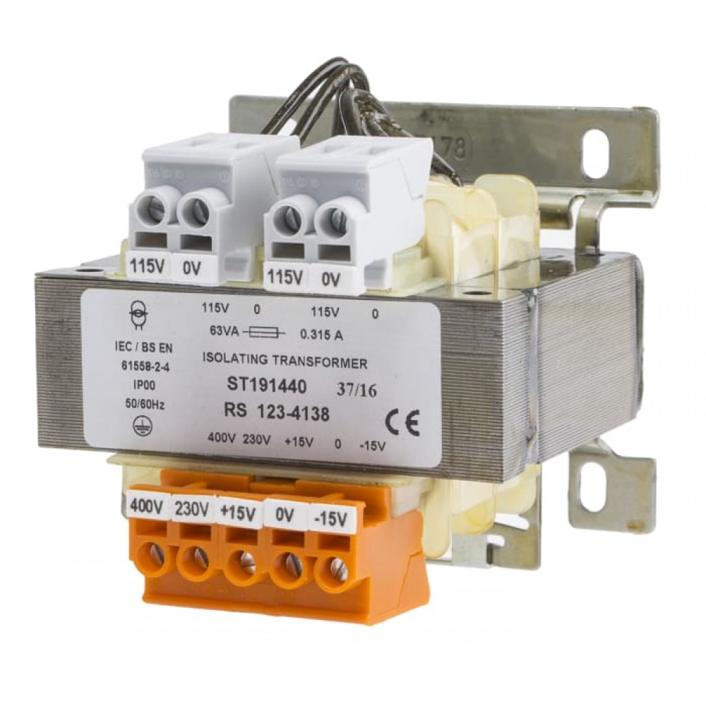 RS Pro Panel Isolation Transformers Single Phase RS Pro high-quality panel isolation transformers are designed for use in general applications. These single phase transformers feature screw connectors for multiple input and brackets for screw fixing or for DIN Rails. They have a standard primary winding 0-230-400VAC with a +/- 15 V adjustment possibility around 0 and are 100% electrical and flash tested.