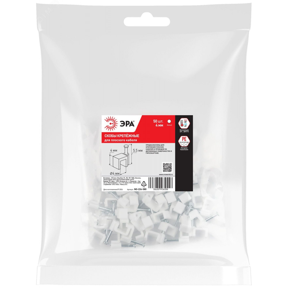 Описание Скоба пластиковая крепежная плоская 4 мм белая NO-224-580 (50 шт/уп) Б0066606