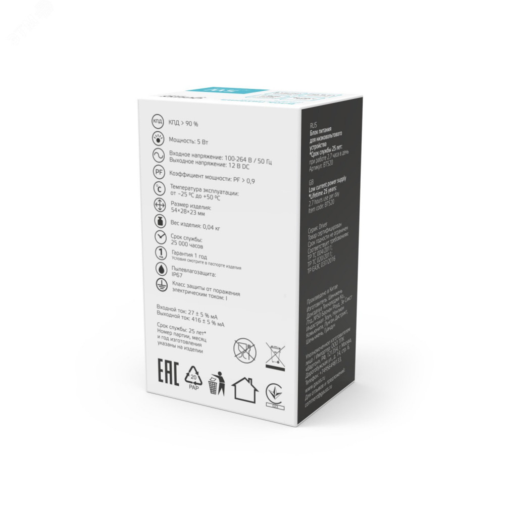 Описание Блок питания для светодиодной ленты 5 Вт AC 100-264В Uвых 12В IP67 54х27х23мм Basic BT520