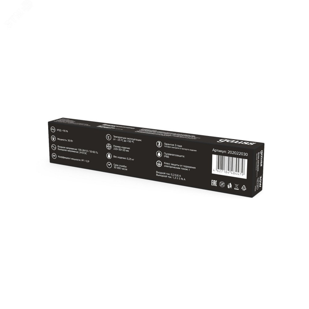 Описание Блок питания для светодиодной ленты 30 Вт AC 100-264В Uвых 24В IP67 220х30х20мм Black 202022030