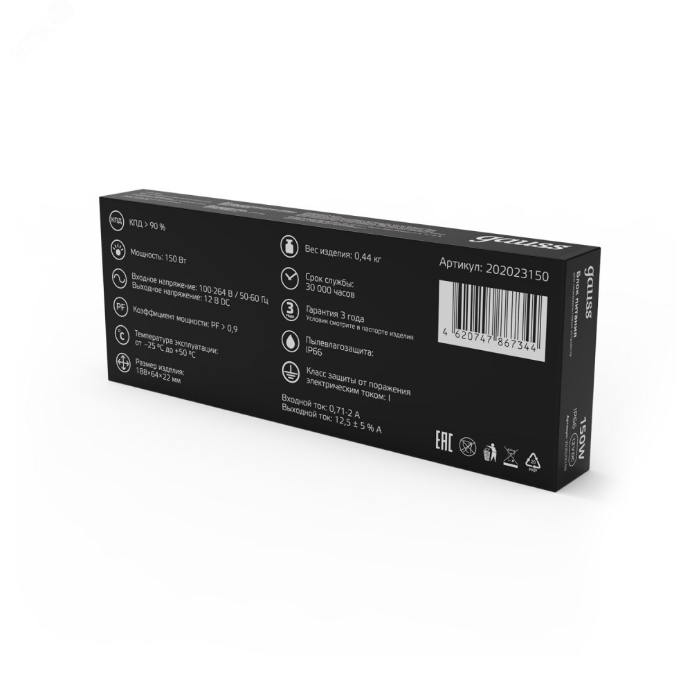 Блок питания для светодиодной ленты 150 Вт AC 100-264В Uвых 12В IP67 188х65х22мм Black 202023150, Аксессуар для светодиодных лент