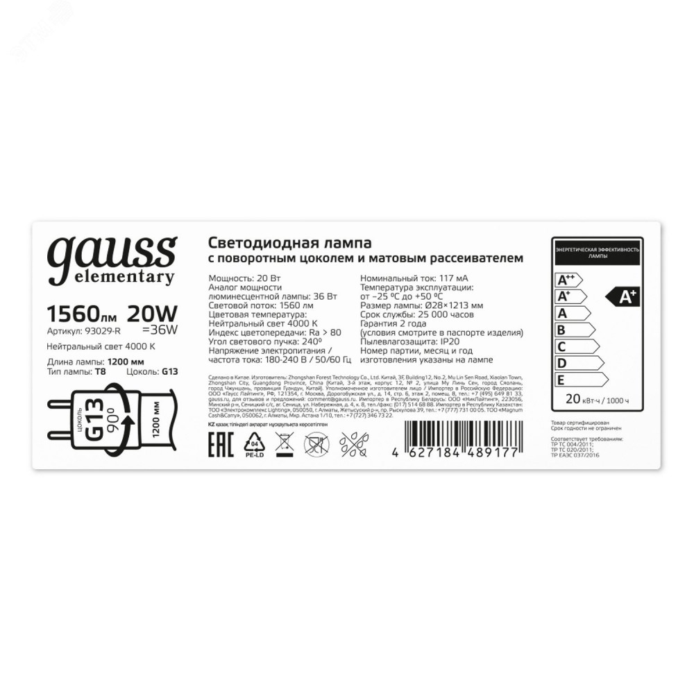 Описание Лампа светодиодная LED 20 Вт 1560 лм 4000К трубка Т8 нейтральный G13 AC 220В стеклянная Elementary 93029-R