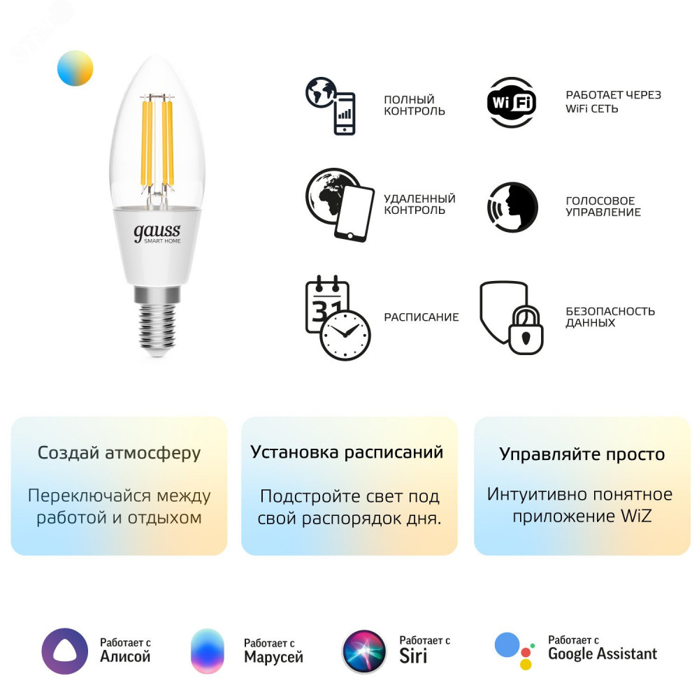Описание Лампа светодиодная умная филаментная LED 4.5 Вт 495 лм 2000-6500К E14 AC 220В IP20 изменение цветовой температуры и диммирование управление по Wi-Fi Smart Home 1250112