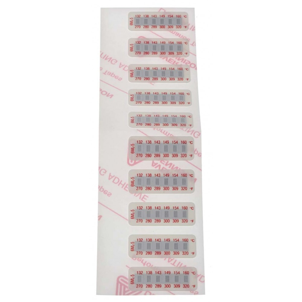 RS PRO Non-Reversible Temperature Sensitive Labels, 6 Levels Introducing the range of RS PRO temperature sensitive labels, ideal for use in the food, automotive, moulding and metal working industries. The labels have been designed as a temperature test strip that will make a permanent and irreversible record of the highest temperature bracket reached when applied to the surface of an object by changing colour. These heat-sensitive RS PRO temperature indication labels are a high quality and cost-effective solution that measures surface temperature accurately and provides reliable proof that the item or product has been maintained at the correct temperature and is suitable for use across a wide variety of applications.