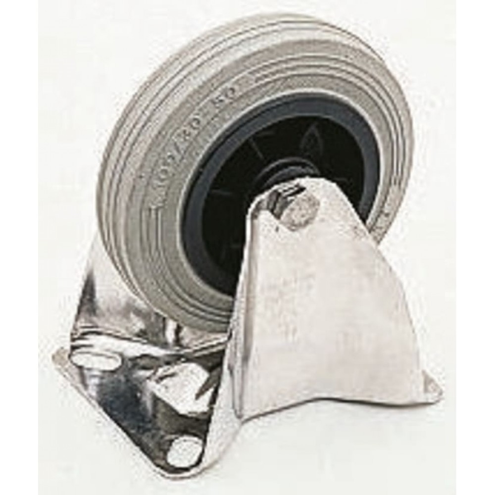 Grey Elastic Rubber Tyre, Black Nylon Hub, Med. Duty, Series INOX 20 - Plate Mt. Plate Fixing castors. Quiet and easy running under heavy loads. Resistant to corrosion, abrasion and shocks. Manufactured from hygienic materials.