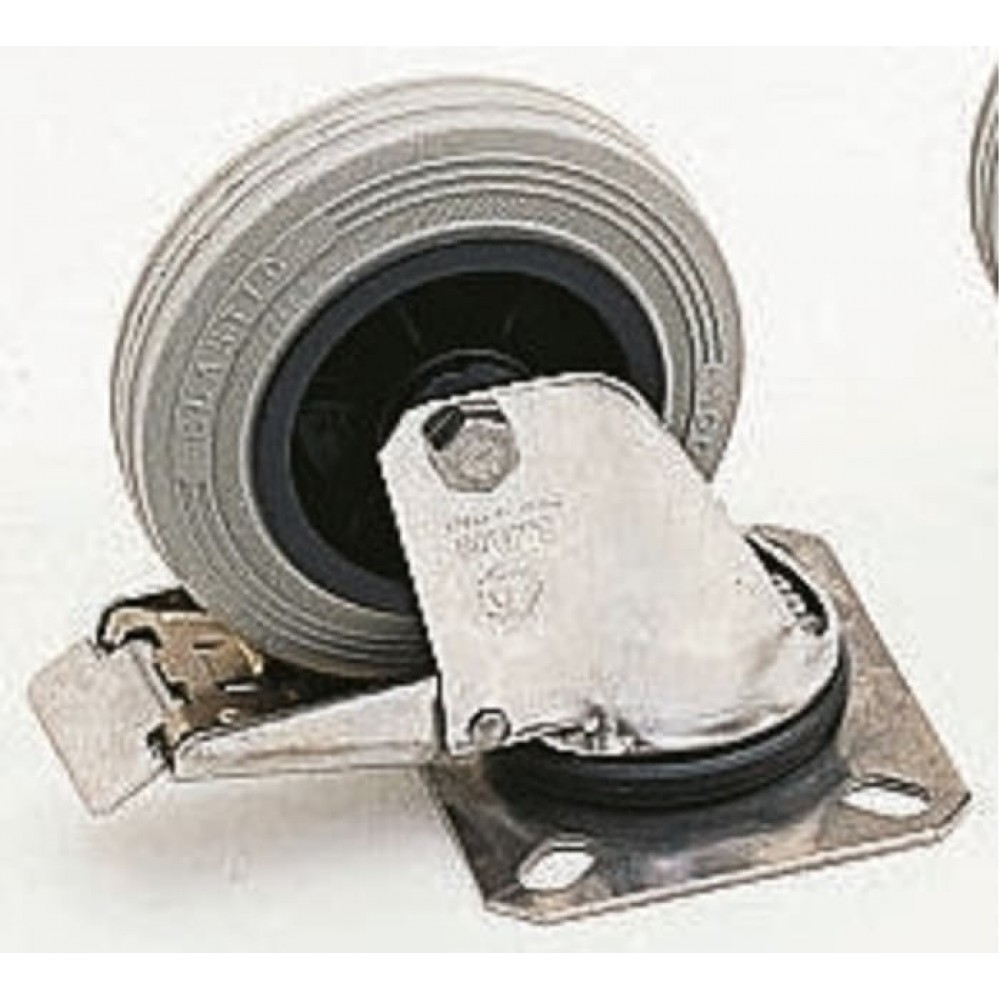 Grey Elastic Rubber Tyre, Black Nylon Hub, Med. Duty, Series INOX 20 - Plate Mt. Plate Fixing castors. Quiet and easy running under heavy loads. Resistant to corrosion, abrasion and shocks. Manufactured from hygienic materials.