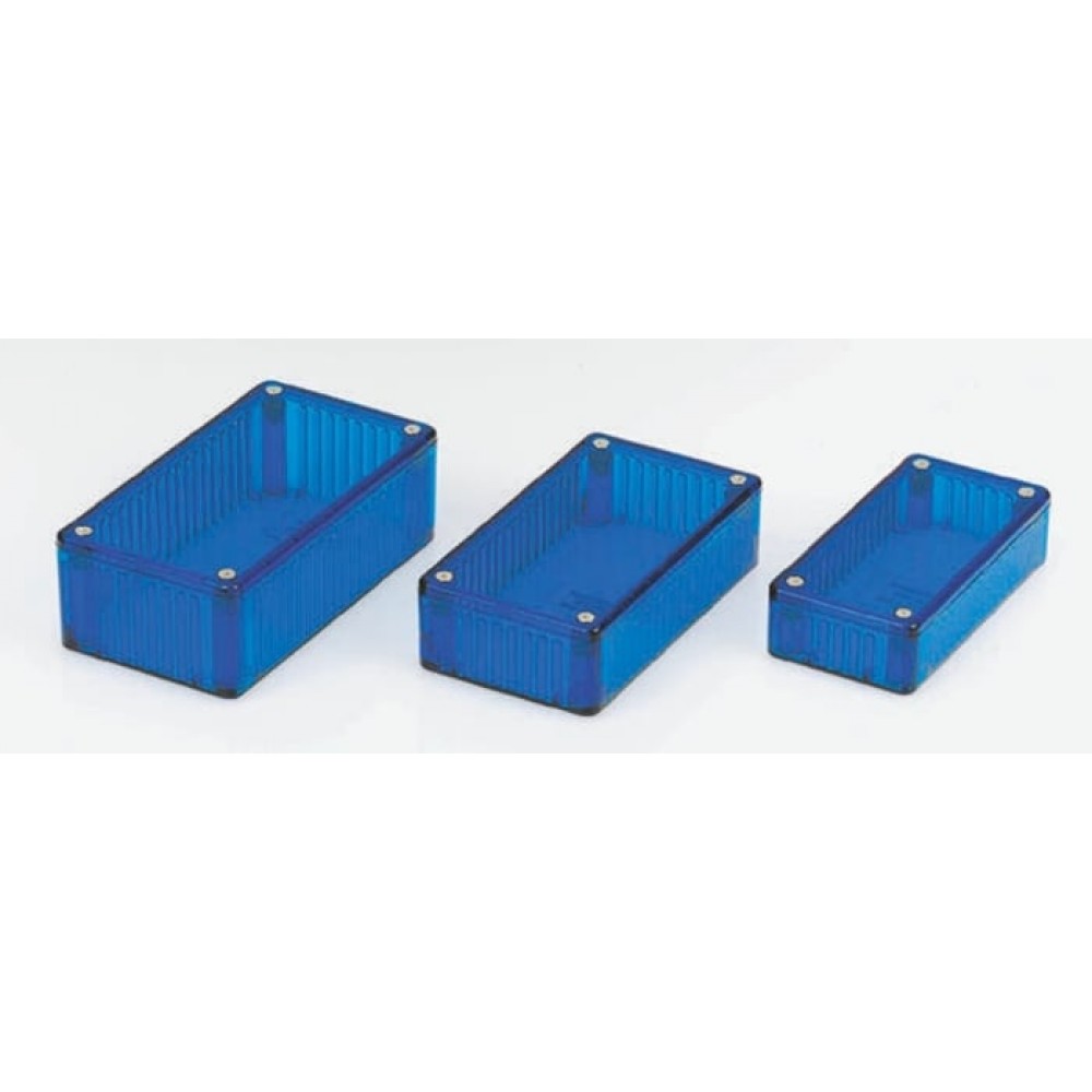Translucent Blue Boxes The Hammond 1551 series is a miniature enclosure moulded in translucent blue, general purpose ABS plastic with a satin texture finish. Each enclosure has 2 PC board standoffs moulded into the interior and a lap joint construction which provides IP54 protection against the access of dust and splashing water. The lid of the enclosure is secured with 2 self-tapping 4x1/2in. screws.