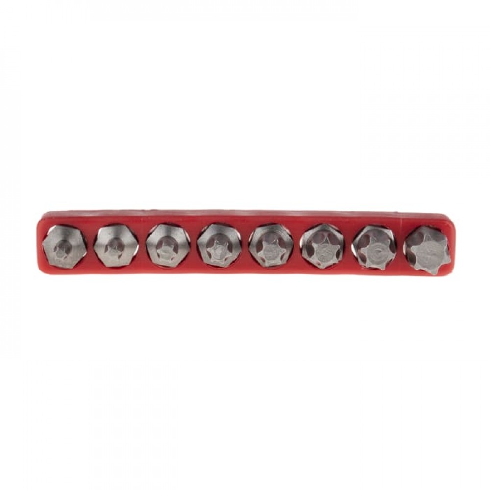 The set contains 8 bits in a variety of sizes and red colour holder.
